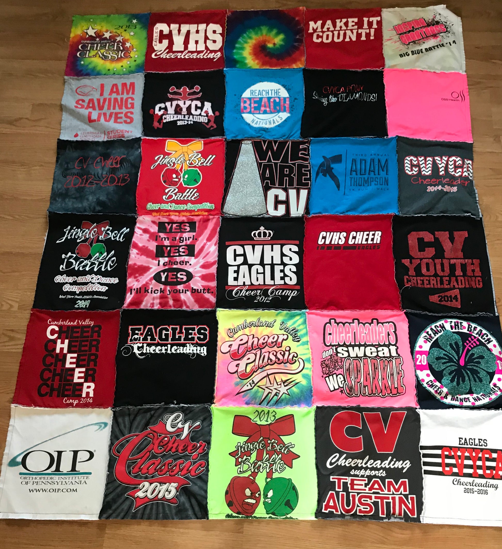 Why throw out or donate those T-shirts your kids (or yourself) no longer wear. Let’s upcycle them!!! Using approximately 29-32 adult T-shirts this size is great for on the couch or a twin size bed. You will mail me the T-shirts and I do the rest! Please mark the T-shirts that are the most important to use. Free return shipping.