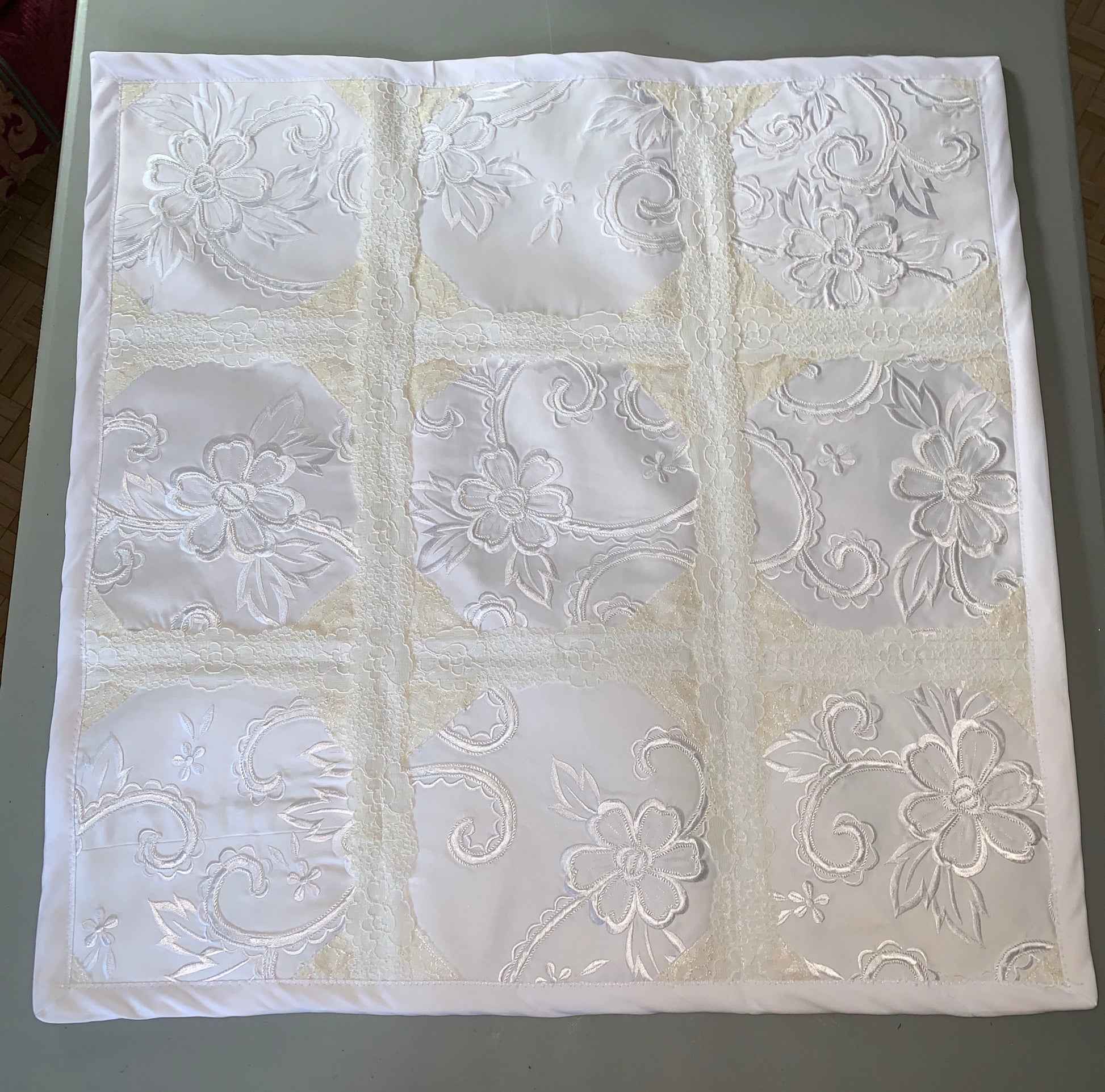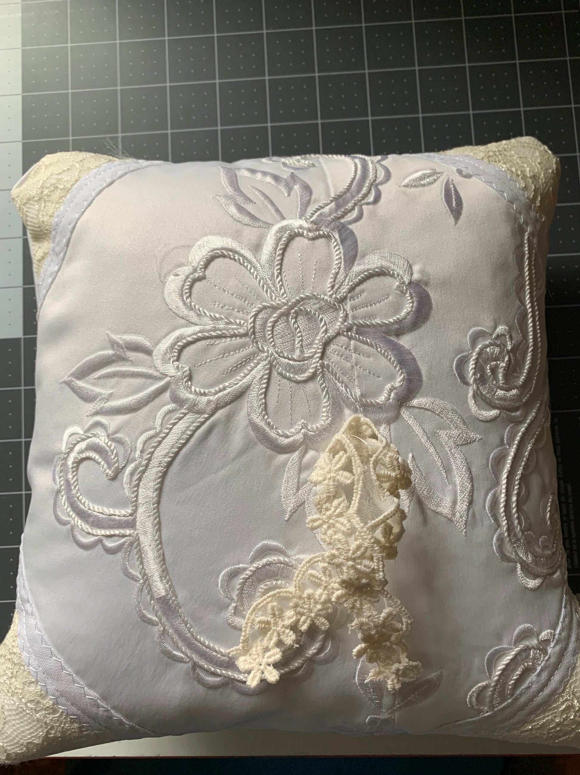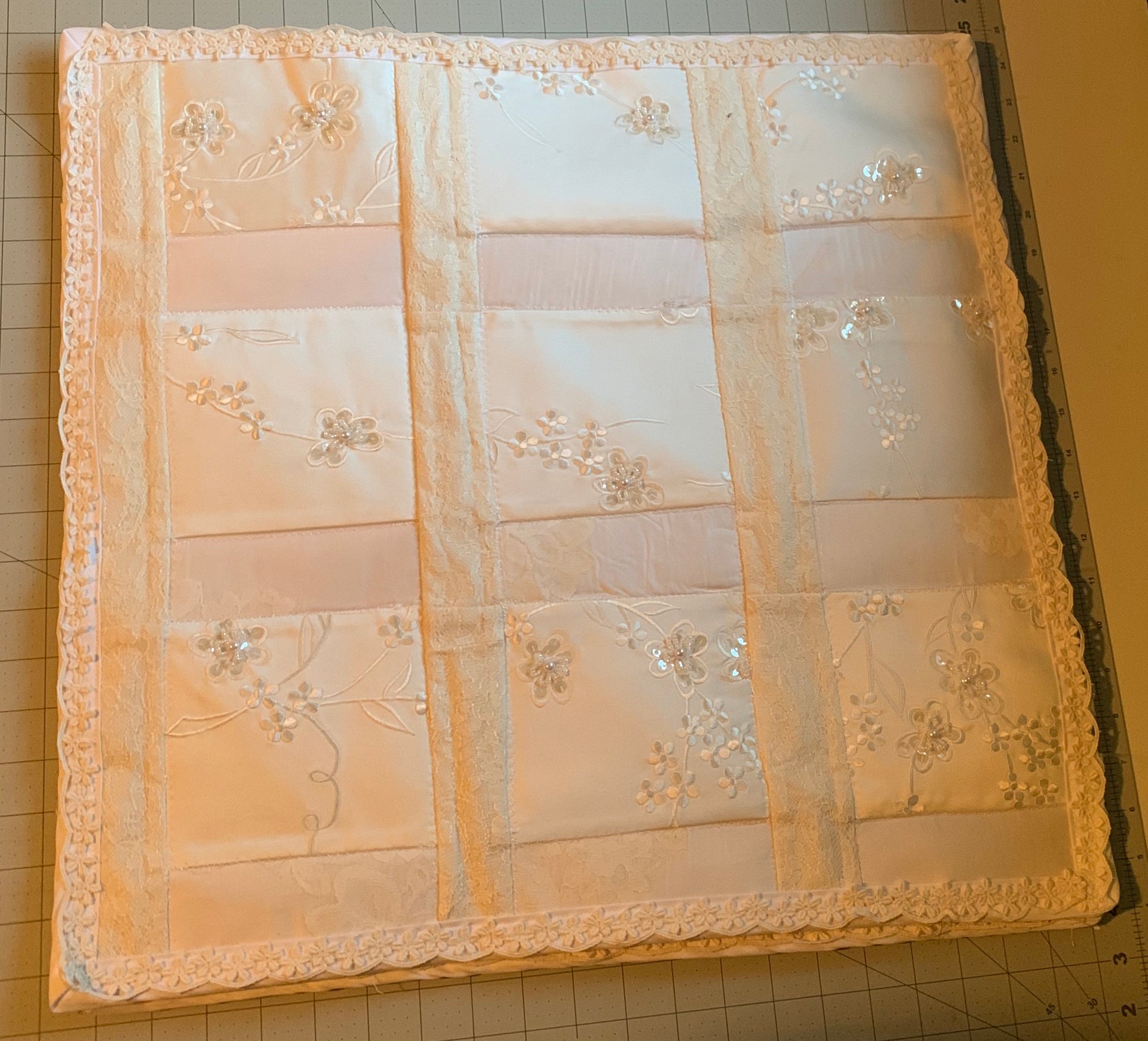 In the pictures I combined 3 generations of wedding dresses to make keepsake wall quilts and ring bearer pillows for the Grandchildren. A wonderful keepsake! This could be done with Wedding dresses or even with Homecoming/Prom dresses.